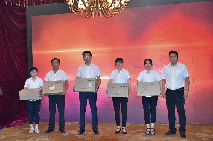 接下來進行的是員工頒獎,包括第二季度優秀服務標兵、6月份優秀銷售員工、第二季度優秀銷售員工,李總為優秀員工頒發獎品并合影留念。獲獎的銷售員一一分享了成功案例,為其他同事做好銷售提供了強有力的基礎。同時,未達成目標的人員也現場兌現了承諾。